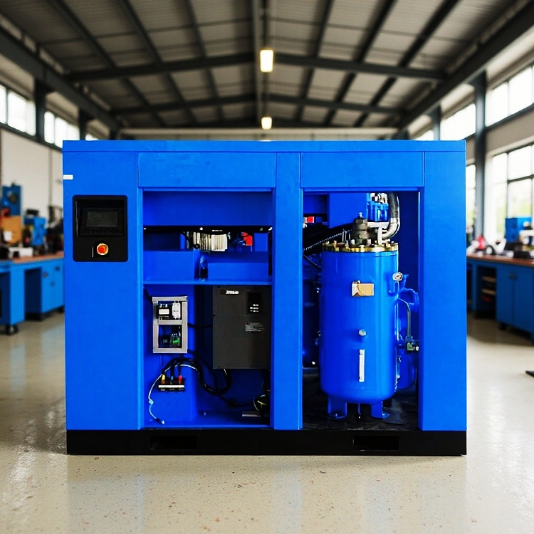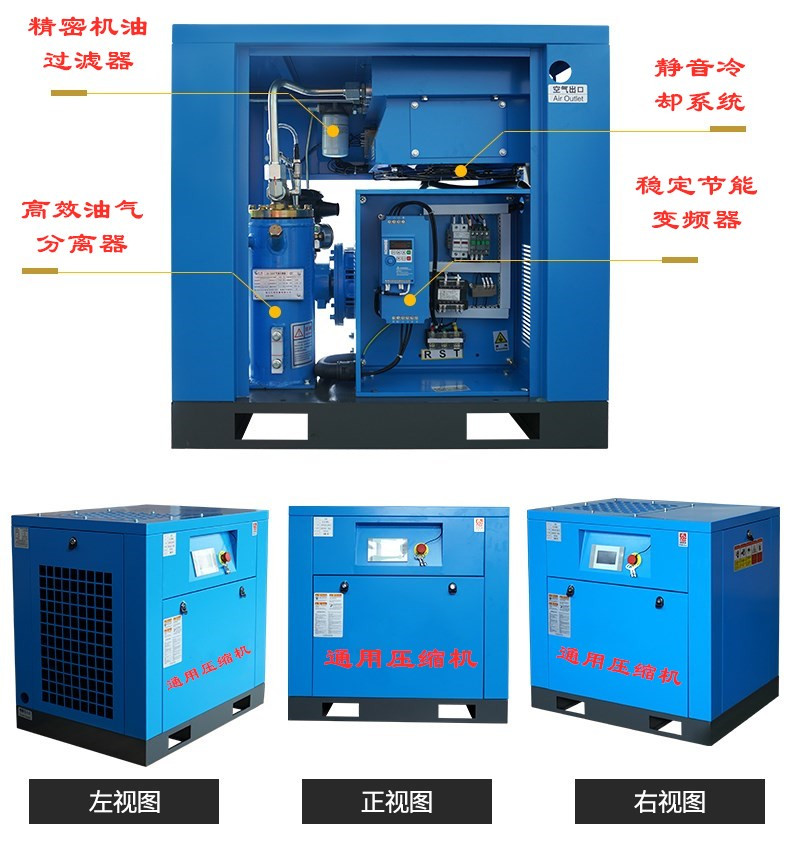 螺杆空压机可带变频器,电机可选标准电机、永磁电机,螺杆空压机主机可选一级压缩机头,二级压缩机头,欢迎用户根据自己的需求选择适合自己的螺杆空压机。