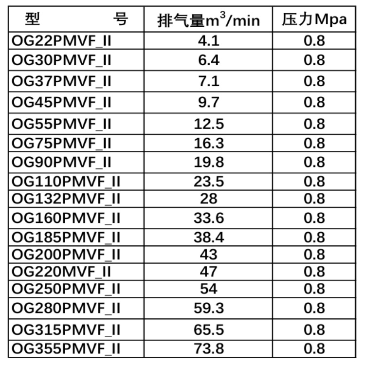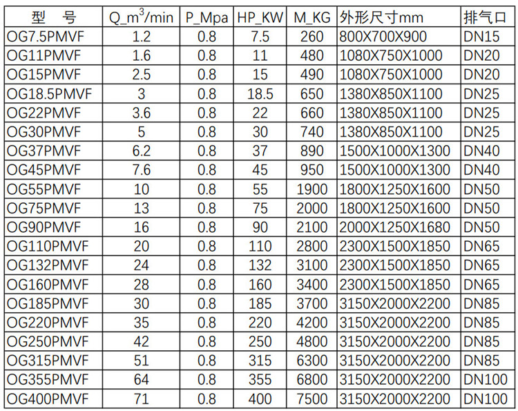 永磁变频螺杆空压机产品参数(0.5,1.0,1.3MPa来电咨询)